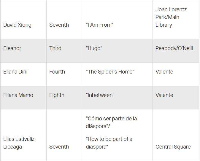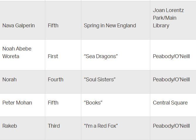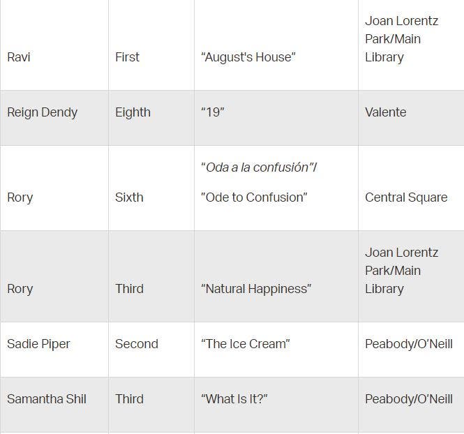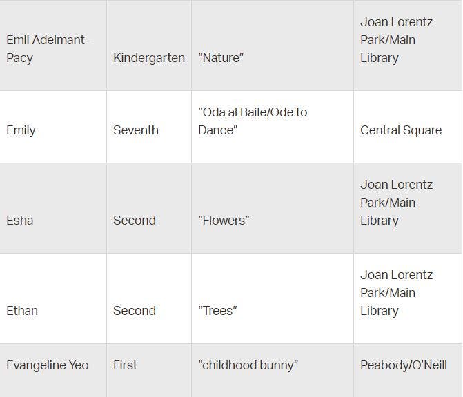 - Peabody School/O'Neill Branch Library, 70 Rindge Avenue, along the fence We hope you will visit all four sites to see this year's 69 winning poems selected from the nearly 700 wonderful entries!