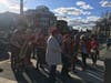 Between 70 and more than 100 people gathered, some with signs and with a police officer standing nearby as well as a band. The group created a “people protected bike lane” along Somerville and Massachusetts avenues and cheered as cyclists drove through.
