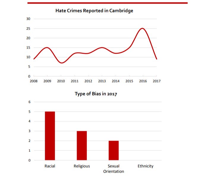 The vandalism comes just after a menorah was stolen from a temple in Brookline >> Menorah From Brookline Temple Found In West Roxbury. There were nine crimes categorized as hate crimes reported in Cambridge in 2017, which is a return closer to average after seeing a large spike in 2016. There have been fluctuations in recent years, ranging from a low of seven in 2010 to a high of 25 in 2016, with the average across the past 10 years being 13, according to police data.
