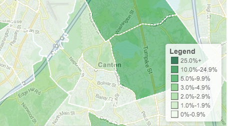 Newscruncher is an ongoing series that breaks down the characteristics of your town. The map below is a snapshot of what section Canton has the most homes valued at $1 million or more.