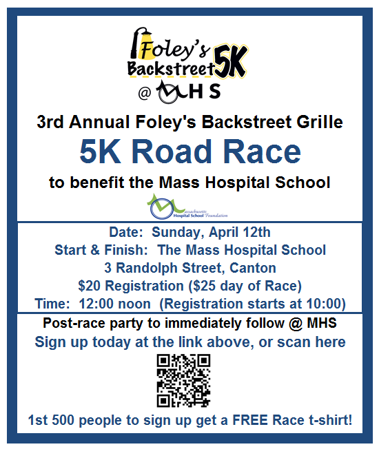 Local favorite restaurant, Foley’s Backstreet Grille is holding its Third Annual 5K to benefit the Mass Hospital School on Sunday April 12th.