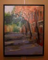 In her artist's statement Sullivan writes, "My approach to painting is uncomplicated. I base my subjects on what are visually challenging to me." From the look of these paintings, Sullivan is visually challenged by movement in nature, such as the play of beads of sunlight against a row of houses -- see Confetti of Sunshine-- or leaves in gentle free fall from a tree, such as in Baldwin Street. There is a feeling, while looking at these paintings, that something is really happening now. You are in this place.