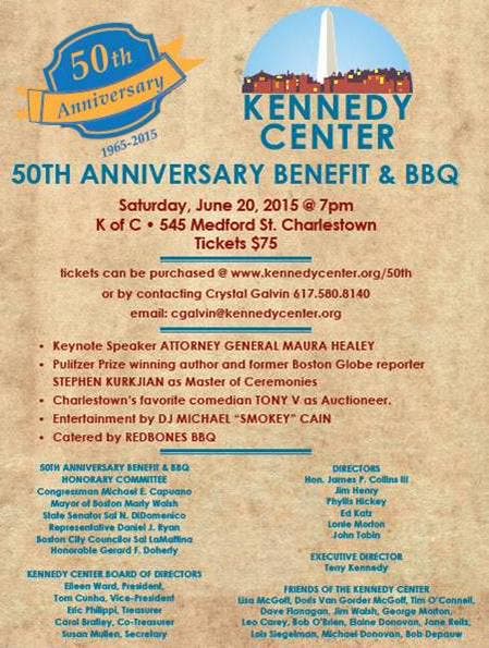 This year the John F. Kennedy Family Service Center, a nonprofit organization with the mission to improve the lives of individuals and families in need, is celebrating its 50th Anniversary of providing education, advocacy, and opportunity in Charlestown. To commemorate this important milestone, the Board of Directors are hosting the “Kennedy Center’s 50th Anniversary Benefit and BBQ” on Saturday, June 20, 2015, 7:00 PM at the Bunker Hill Knights of Columbus (545 Medford St. Charlestown).