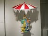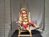 Not only are there dolls on the wall, but some are hanging from the ceiling. "Inga," a cloth doll totally made by hand sits near the entrance in an easel made to look like a chair. Dara Pannebaker, the artist, said making Inga was a labor intensive journey of following a pattern from start to finish. Not used to the stringent discipline of following a pattern, Pannebaker acknowledged that you sometimes have to "push yourself in different directions."