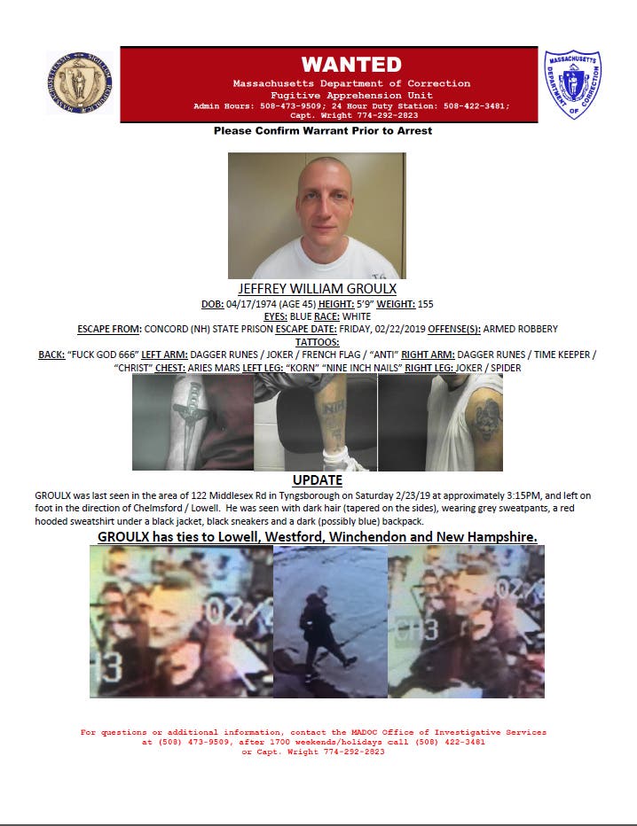Groulx was last seen Saturday, Feb. 23 around 3:15 p.m. on the 100 block of Middlesex Road in Tyngsborough. He fled on foot in the direction of Chelmsford and Lowell.