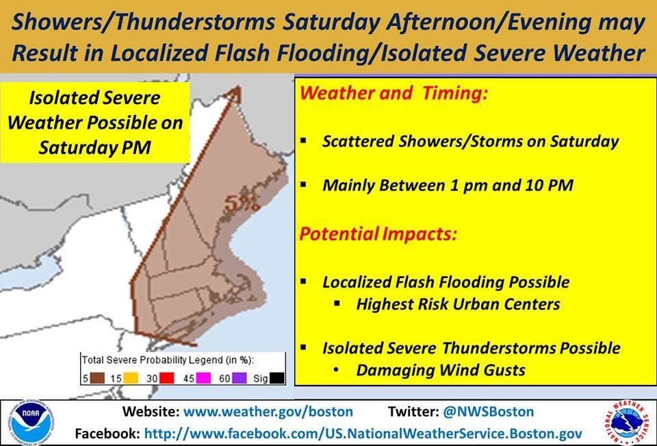 Heavy rain, severe thunderstorms and flash flooding will all be possible across most of New England on Saturday afternoon and evening, according to the National Weather Service.