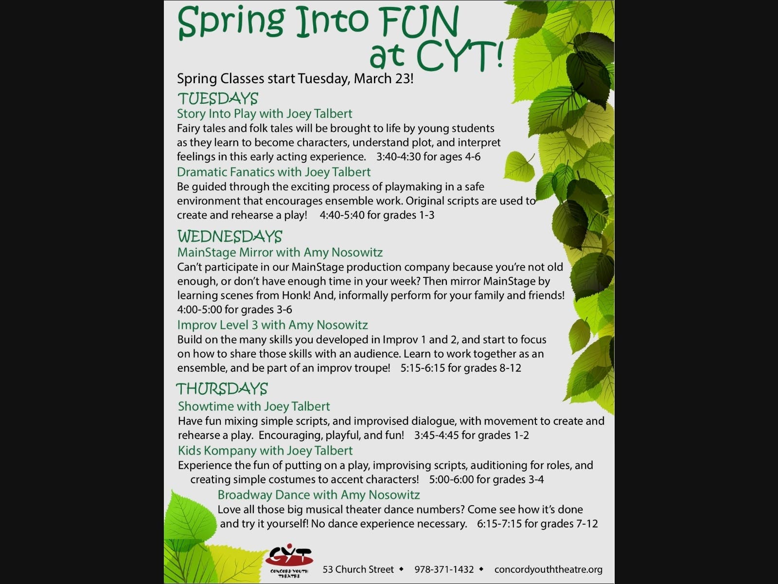Concord Youth Theatre offers Spring classes and workshops for students in Pre-K through Grade 12.