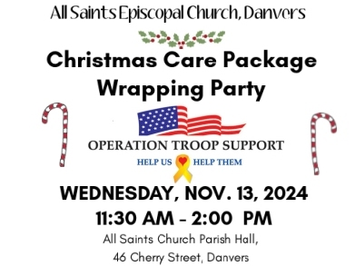 For our Troops: join us as we wrap Christmas care packages that Operation Troop Support will send to our deployed troops. They will bring Zip-lock bags with items such as socks, soap, deodorant, candy, and puzzle books for us to wrap and label to designate gifts for men and women. Please consider donating some Christmas wrapping or Zip Lock bags. it would be much appreciated. Pizza and tasty goodies will be served and music will be provided on keyboard by Michael Mazurkiewicz, All Saints' music director.