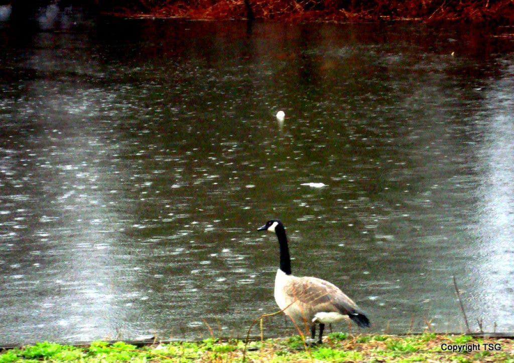 A passer-by thought that the goose was stuck in the ice and called the Fire Department. Firefighters arrived to find that the goose was not stuck in the ice on the frozen pond.