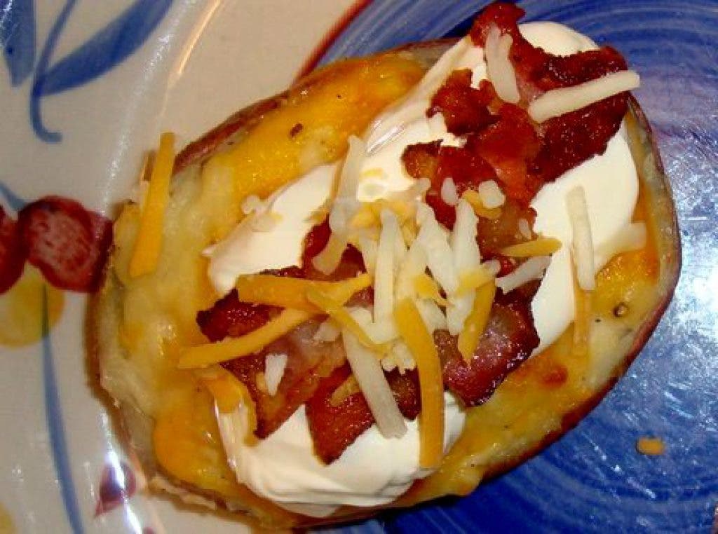 Preheat oven to 375. Wash and dry potatoes, and set directly on rack in center of the oven for 1 hour. Place bacon on cookie sheet on wire rack, or on broiling pan, and place in oven on lower rack for 20-25 minutes, or until browned and crispy. Remove bacon, set aside to cool, cut or chop into bits for topping.