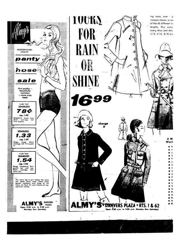 Almy’s was where ladies bought their pantyhose. They were usually on sale, and I know this because I’ve seen ads for them. Proportioned length pantyhose for 78 cents (regular price $1). They were billed as being first quality, seamless and that some even had nude heels. This was exciting stuff for the time.