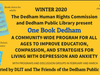 “One Book Dedham” is a collaboration between the Dedham Human Rights Commission and the Dedham Public Library, with the support of DLIT, the Dedham Public Schools, and the Friends of the Dedham Public Library. “One Book Dedham” hopes to engage the community through literature and other events in a discussion about mental health awareness. Specifically focused on depression and anxiety across all age groups, from children to seniors, the program will include many individual events and multiple levels of community engagement to improve education, compassion, and strategies for living with depression and anxiety. This program marks the tenth consecutive year that DLIT has helped bring a community-wide reading program to Dedham.