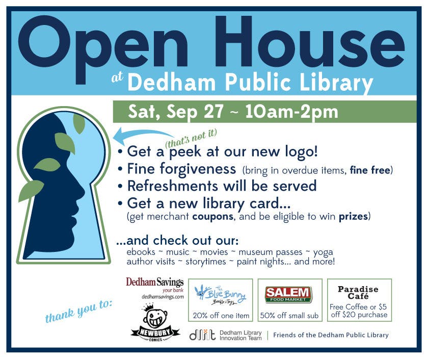 Help us celebrate the end of Library Card Sign-Up Month and see the full reveal of the new library logo this Saturday, September 27th, 10am-2pm! Enjoy some light refreshments and fine forgiveness for overdue items.