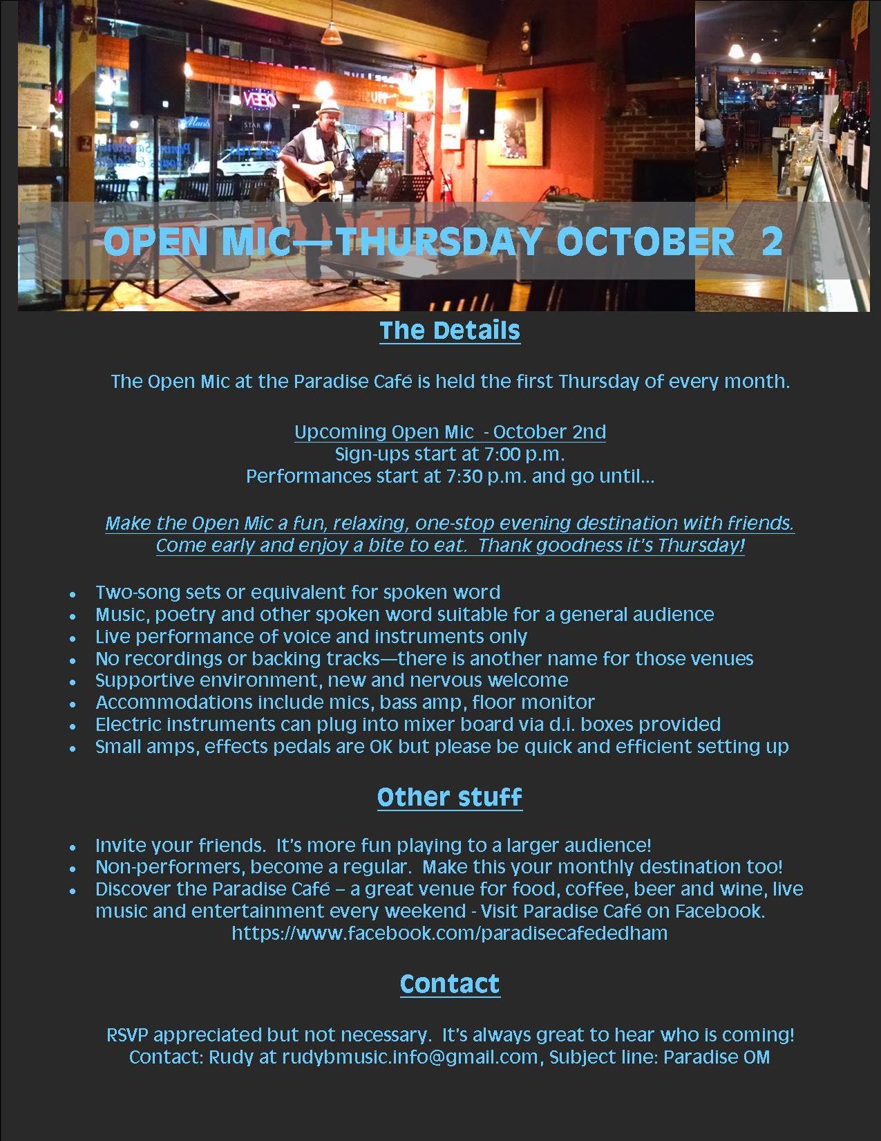 The Open Mic at the Paradise Café is held the first Thursday of every month.
