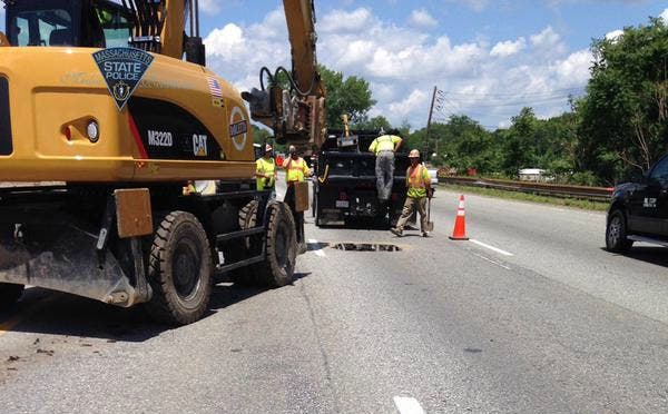 Massachusetts State Police say crews worked diligently to repair the large divot that formed in the middle of roadway near exit 19 in Needham.