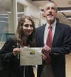 PHOTO CAPTIONS: Minuteman student Melanie Hennessey of Dover accepts congratulations from Battlegreen Run Foundation, Inc. president Steve Sartori for winning the Foundation’s logo design contest and $100 scholarship. Also shown is the winning logo.
