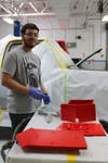 Collision Repair & Restoration junior, Isaias Gutierrez, of Brockton, was enlisted to paint out the repaired box. He said, “I used a dual action sander on the five different pieces, then a red scuff pad before priming, and a spray gun for paint.”