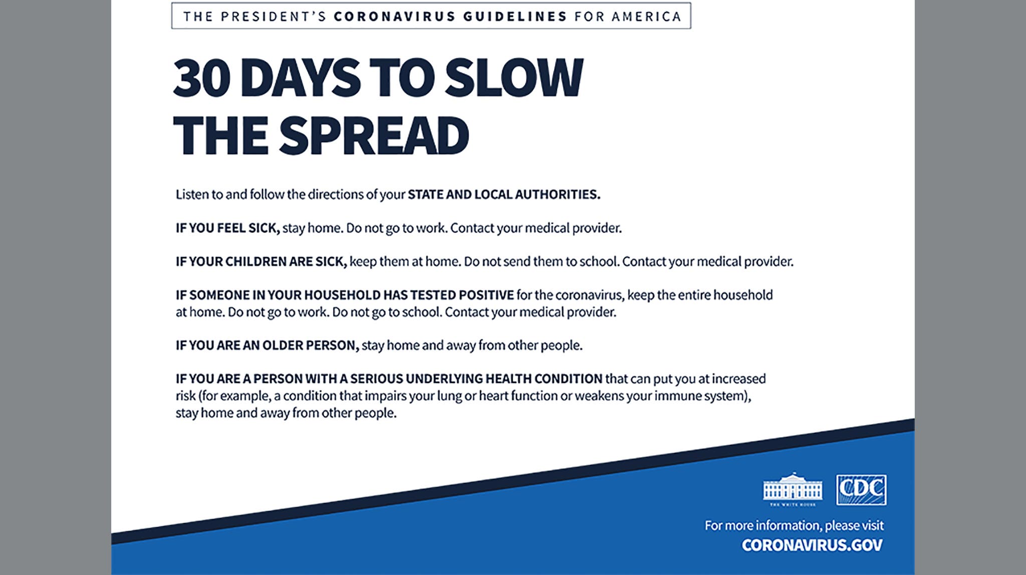 THE PRESIDENT'S CORONAVIRUS GUIDELINES FOR AMERICA. 30 DAYS TO SLOW. THE SPREAD
