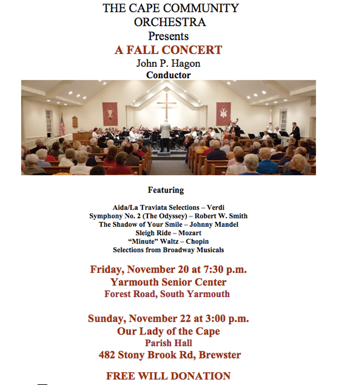 Cape Community Orchestra will present its Fall Concert Series on Friday, November 20, at 7:30 PM at Yarmouth Senior Center, 528 Forest Road, in South Yarmouth, and Sunday, November 22, at 3 PM, at Our Lady of the Cape Parish Center, 468 Stony Brook Road, in Brewster. Note that the Sunday concert location has changed from earlier announcements.