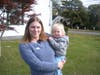 11:30 a.m.: Falmouth resident Alyssa Foster exits the church with an "I Voted" sticker proudly displayed on her sweatshirt, and baby Abbie in tow.