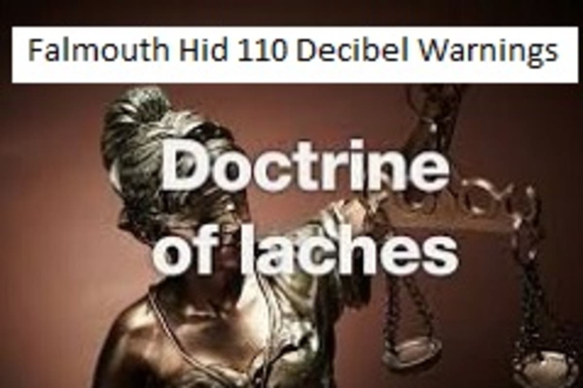 A doctrine called “laches” is defined as an unreasonable delay or negligence especially in pursuing a right or claim. How can the Town of Falmouth claim the wind turbines can be protected by the legal doctrine when they hid documents that showed the 110-decibel wind turbines should not have been built in the first place.