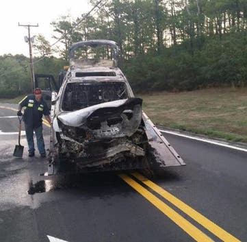 Top photo: A shot of a burning vehicle that a woman was pulled from in Bourne on Sept. 11, 2016. (Credit: Bourne police)