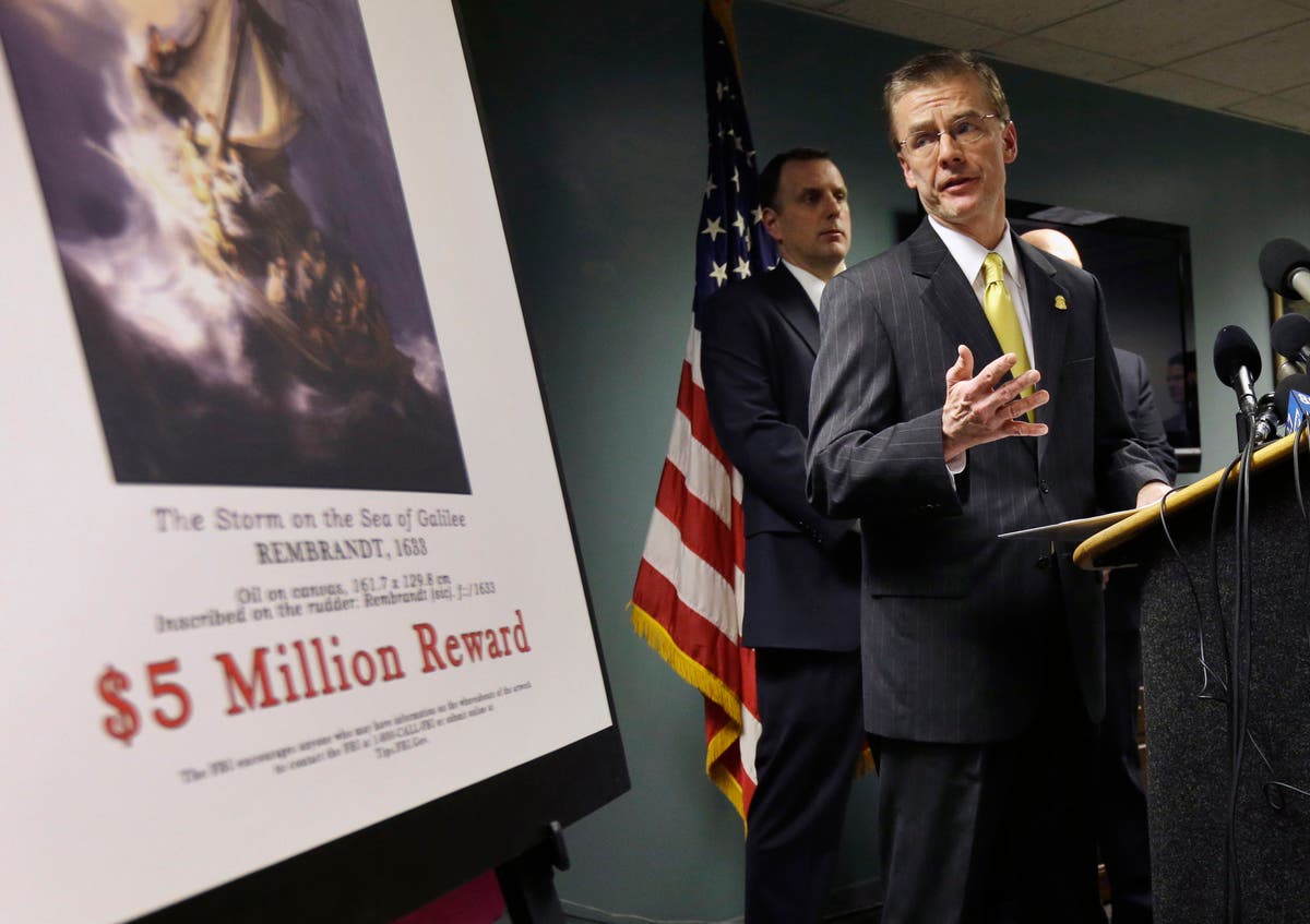 Federal Bureau of Investigation (FBI) Special Agent in Charge Richard DesLauriers, right, stands next to a poster that shows a Rembrandt painting and a reward while facing reporters during a news conference at FBI headquarters in Boston, Monday, March 18, 2013. (AP Photo/Steven Senne)