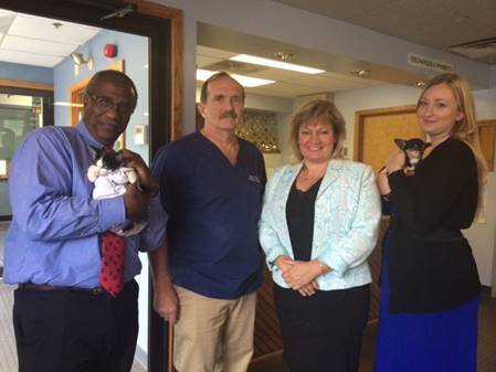 Photo Credit: DAR Commissioner Greg Watson, Dr. David Dunn of North Shore Animal Hospital, Animal Rescue League of Boston Vice President Dr. Martha Smith-Blackmore, Massachusetts Animal Fund Coordinator Lauren Gilfeather and two of the Hospital’s patients. Photo by Amy Mahler