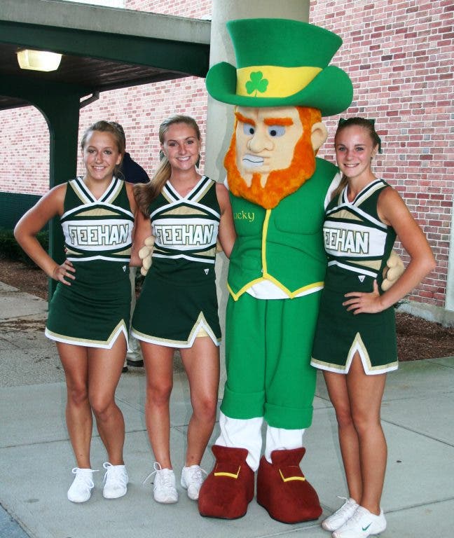 In the attached photo, Lucky the leprechaun poses with Feehan cheerleaders, from left, Melanie Brondyk (Mansfield), Colleen Barthe (Norton), and Taylor Belham (N.Attleboro).