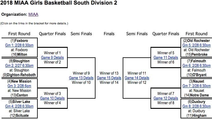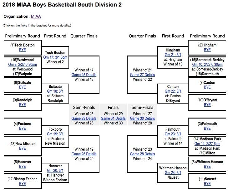 The Warriors have been awarded the top seed in the Division 2 South tournament and will start postseason play against No. 16 Milton Feb. 28 at 6:30 p.m. The winner will play the winner of No. 8 Stoughton vs. No. 9 Dighton-Rehoboth.