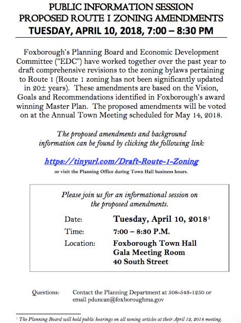 The zoning proposals to be voted at the May 14th Town Meeting are quite detailed but are extremely important to the future of the Town of Foxborough. During the Master Plan process, residents identified Route 1 as the “economic engine” for Foxborough, and many financial models for Foxborough’s future are based on projected revenues from high quality development anticipated to be built on Route 1. Without approval of these zoning amendments at the Annual Town Meeting, the high quality development envisioned is unlikely to come to fruition.
