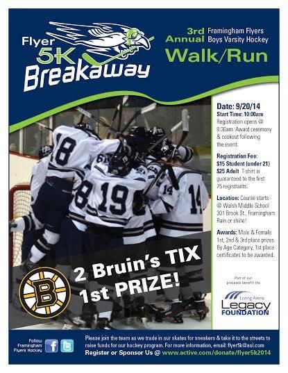 The Framingham Flyers Boys Hockey Team presents the 3rd Annual Flyer 5K Breakaway Walk/Run Saturday, Sept. 20 at Walsh Middle School.