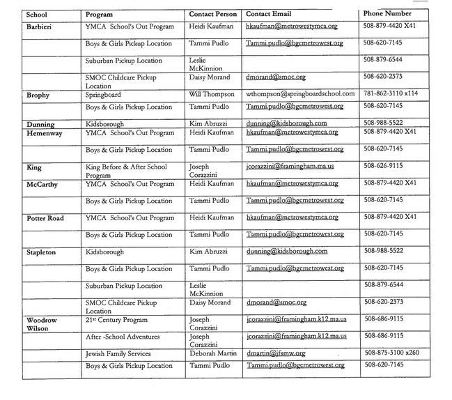 Framingham Public Schools has several outside and internal vendors who provide before and after school care at the elementary school level. Providers are determined by a bidding process, according to the Framingham Public Schools.