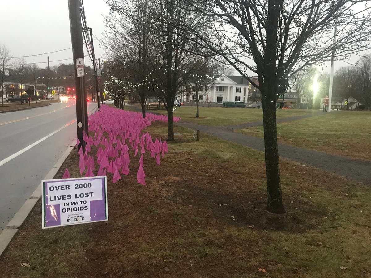 Over 2,000 purple flags stand on the Framingham Common lawn, representing more than 2,000 lives that were lost to substance use disorder in the state last year. Framingham FORCE (Fostering Opioid Recovery Compassion & Education) organized a vigil held Saturday afternoon in an effort to bring the community together and offer support to people and families with loved ones suffering from substance use disorder.