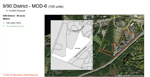 The simple solution, which has been raised before, is to zero out the Nobscot development and switch the units required by the MBTA Communities Law to the Staples property. Its latest iteration is shown below (taken from the cancelled Planning Board meeting agenda):