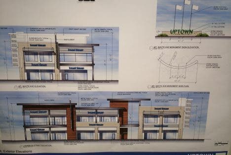 Architectural drawings presented to the Planning Board have the new buildings covered in a combination of limestone veneer with mahogany paneling. The plaza’s sign features the name “UPTOWN” in large letters.