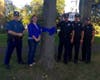 Photo: MA State Police Trooper Timothy Harris and his wife Amanda stand near one of the trees decorated with a blue ribbon at the Common. Showing appreciation for their efforts are Grafton Officers John Ropiak, Robert Collette and Michael Rybak. Credit: Grafton Police