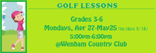 Lessons will be provided at the Wenham Country Club on Mondays from 5pm-6pm. Register online at www.hwrecreation.com