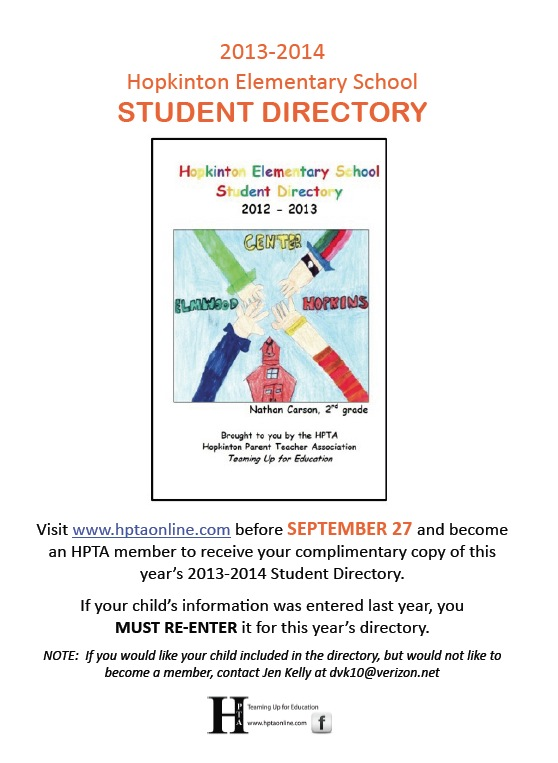 Visit www.hptaonline.com to sign up for HPTA membership and to enter your children's information in the 2013-2014 elementary student directory.