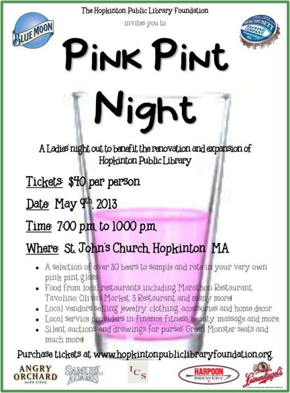 Hopkinton Public Library Foundation, Inc. is pleased to announce “Pink Pint Night,” a ladies night out to benefit the renovation and expansion of Hopkinton Public Library. The event will be held on May 9th, from 7:00 to 10:00 P.M., in the Parish Center of St. John’s Church in Hopkinton. Sample 30 different varieties of beer in your own souvenir pink glass and enjoy food from local restaurants, including Marathon Restaurant, Tavolino, Oliva’s Market, 3 Restaurant, Mangia Pizzeria, Mexico City Taqueria, Not Your Average Joe’s, 5 Star Sweets, Dream Dinners, and more! Also, browse and shop vendors of clothing, jewelry, accessories and home décor, and service providers offering massage, fitness, beauty, and finance. Tickets are $40 per person and may be purchased at www.hopkintonpubliclibraryfoundation.org. Please note that this event is for adults aged 21 and over (please bring an I.D. to the event). “Pink Pint Night” is expected to sell out, so get your tickets early!