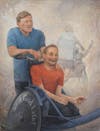 The painting captures the strong bond between father and son. Situated behind Rick's racing chair, Dick leans forward with his hand on Ric's shoulder. To the left of the figures, is a hazy image from behind of the two powering through a race.