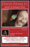 Tickets: David Francey, Right of Passage Tour: Saturday, March 19, 2011, 7:30 p.m. Hopkinton High School Auditorium. Tickets are $20 and are available at the door the evening of the performance.