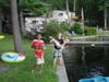 Tug-of War: Make sure to mix up age groups and teams are evenly matched. Provide long, sturdy rope stretched across some body of water, i.e., small-plastic pool, "slip n slide", or sprinklers. Tie a handkerchief in the middle. The team that pulls the hanky across the middle, or kids into the water, wins!