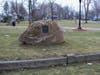 To the right of the gazebo, disguised as large boulders, are monuments.