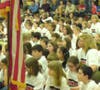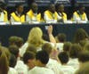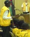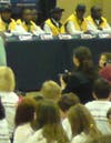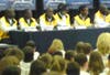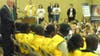 The Kenyans, wearing yellow vests and black hats, entered and exited through a cloud of smoke, confetti cannons and cheers. After Kiprono Cheruiyot and Okayo spoke – Okayo was especially moving in her comments on what it meant to be welcomed by the Hopkinton children - the students sang and danced a Kenyan song for the runners.