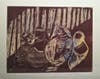 Artist Myrna Balk donated works in three different media, an etching, woodcut, and photograph. “I research in the library for both content and technique,” she said.