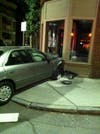 A sedan crashed into the door area of Jamaica Plain's new burger bar, Grass Fed.