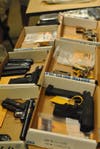 Boston's top cop spoke in front of two tables filled with evidence from the raids, including three guns. Police say they seized "large levels" of heroin, crack cocaine, marijuana and cash.