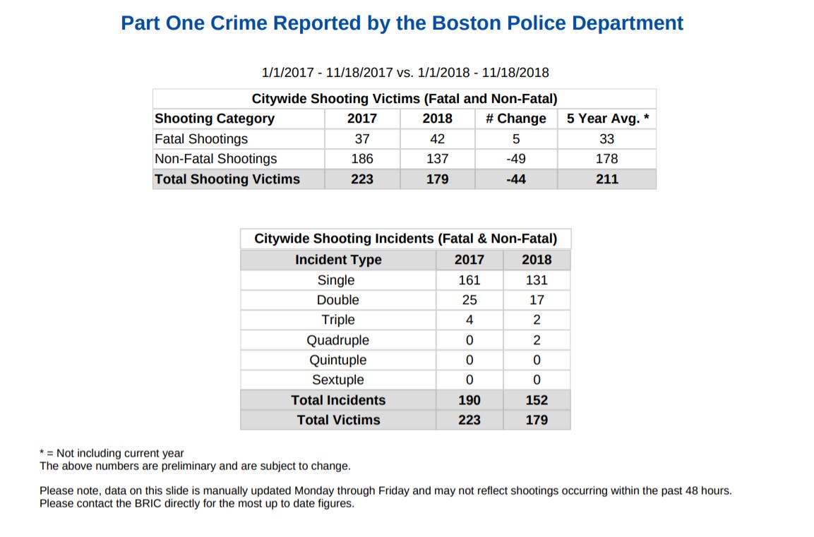 Between Jan. 1 and Nov. 18 there were 42 fatal shootings in Boston, five more this year than the same time last year, according to police data. Still, overall, shootings are down this period compared with last year.