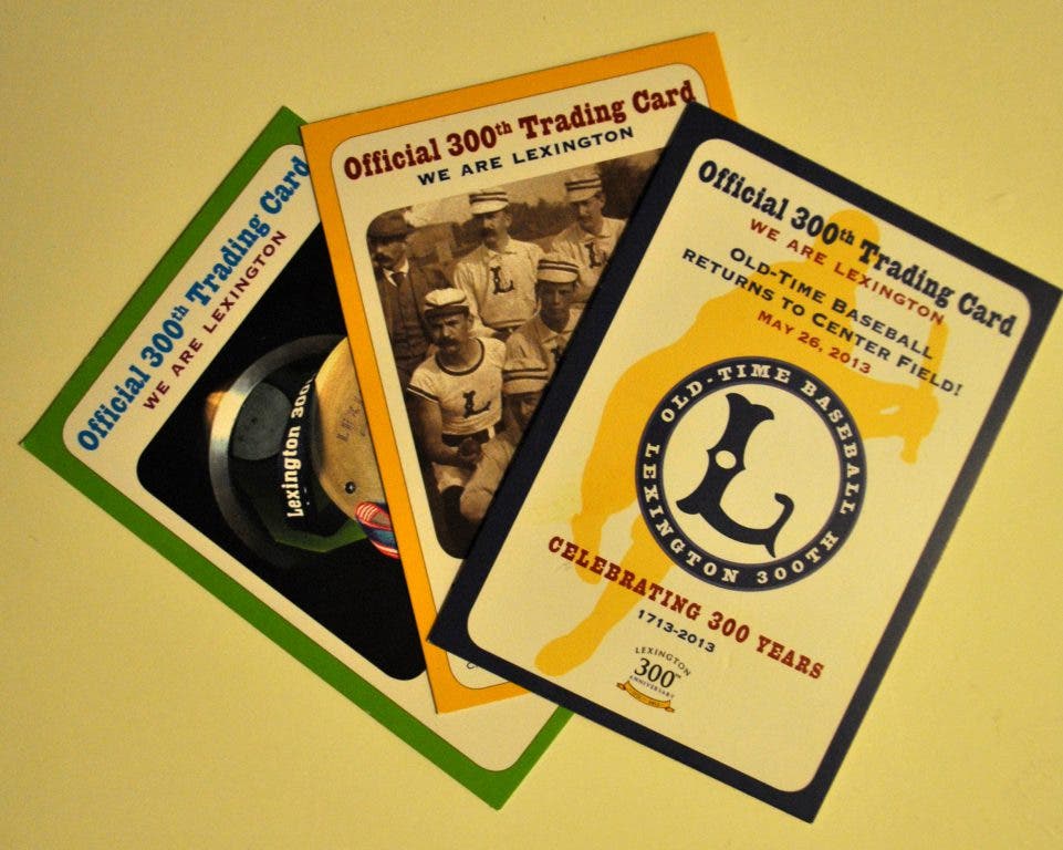 Attention: Collectors! The first 300th Official Trading Cards have landed in Lexington. Initial Trading Card subjects were selected to draw attention to the exciting events that will take place Memorial Day weekend, including the Old-Time Baseball Game and Time Capsule Ceremony.